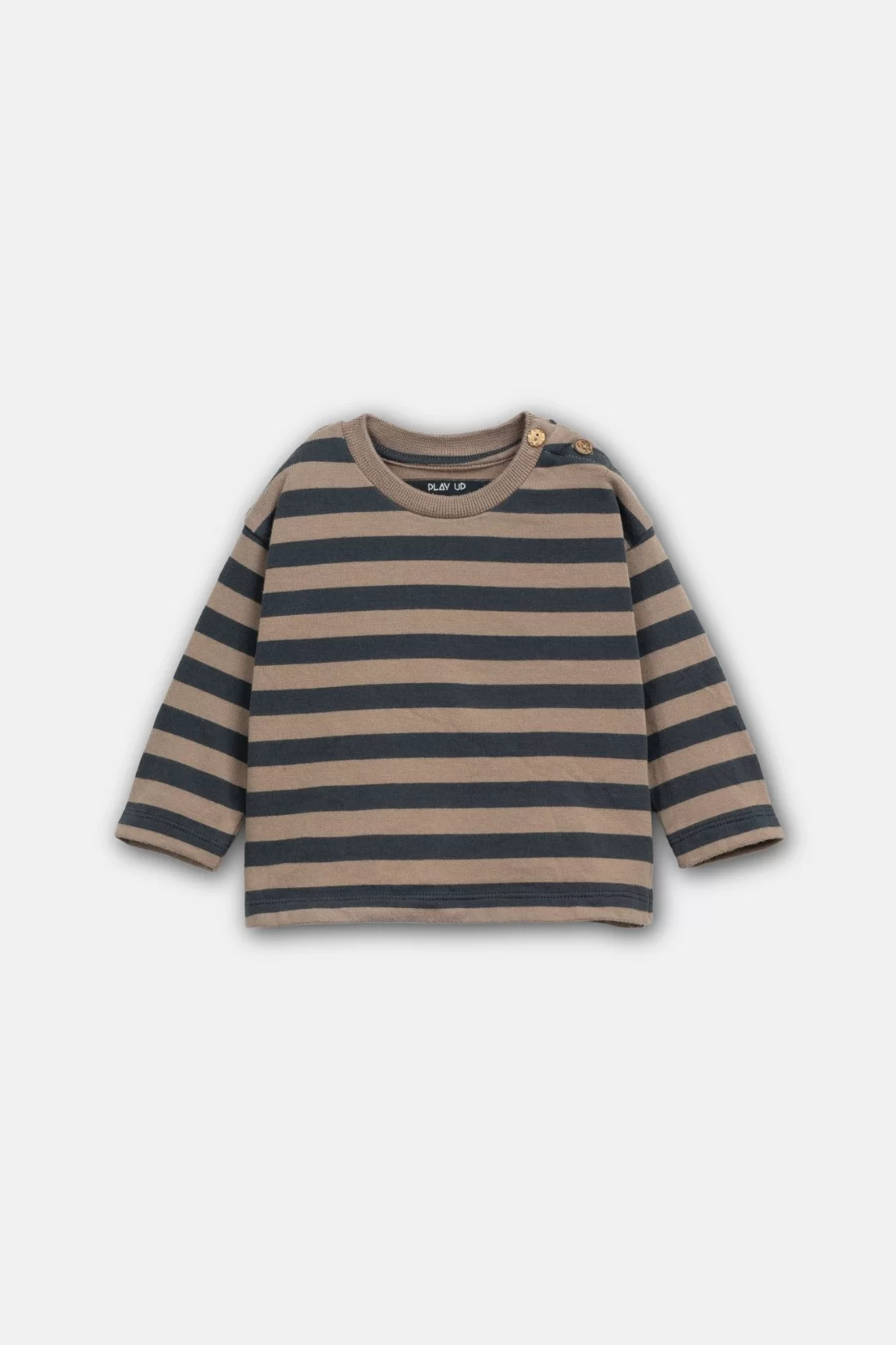 Play Up Baby Striped Jersey Longsleeve T-shirt in de kleur Grafite met houten knoopsluiting bij de schouder. Ideaal als extra laagje onder een vest en/of sweater of playsuit. Het gebruik van biologisch en regeneratief katoen maakt dit een bewuste en duurzame keuze voor je kindje.